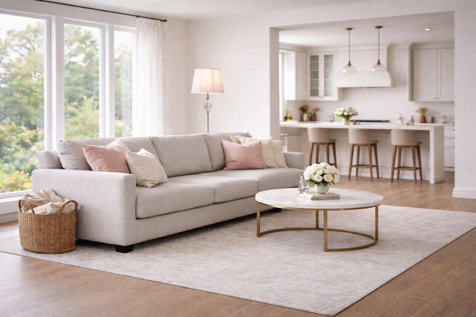 Positioning floor lamps beside sofas or reading chairs further reinforces the living room zone. This helps make the seating area feel cosy and defined, even within a larger open layout.