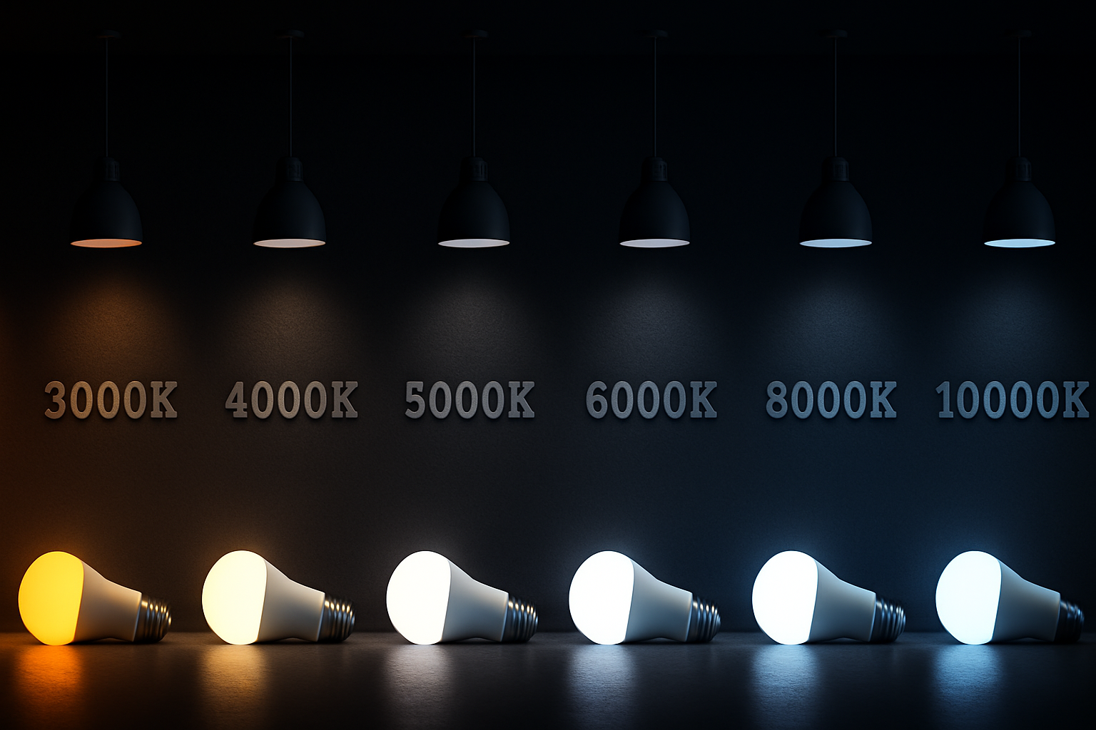 Colour temperature describes how “warm” or “cool” the light appears. Lower Kelvin values create cosy, amber tones, while higher Kelvin values produce crisp, bluish light.