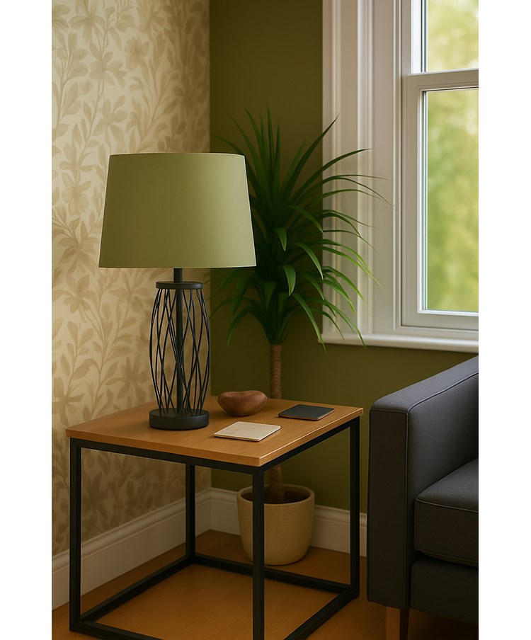 A satin black metal lattice cylinder on this modern lamp base with a striking lantern style. Quality metal finish and includes a hand finished lamp shade. Requires 1 x SES/E14 20watt LED bulb (not included) (100 watt incandescent equivalent) and in line switch for your convenience. Versatile in size and profile it is suitable for any living space in your home.