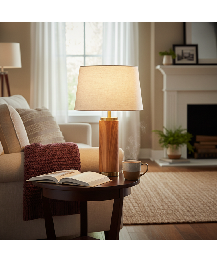 The medium oak effect finish on table lamp is offset by the modern metal details and co-ordinated lampshade, for a unique, contemporary look. The base itself is made of metal, and the wood effect is a print giving you the look of real wood but with a robust easy clean surface that won't damage your furniture. The neutral, stylish colour scheme a will complement a range of interiors and introduce an element of contemporary glamour into your home.