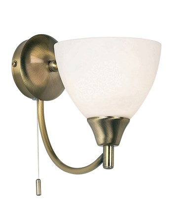 The Endon Alton is a single wall light with an antique brass and opal glass finish; both dimmable and suitable for use with energy compatible lamps. Matching items available in this range, and it also comes in satin chrome.