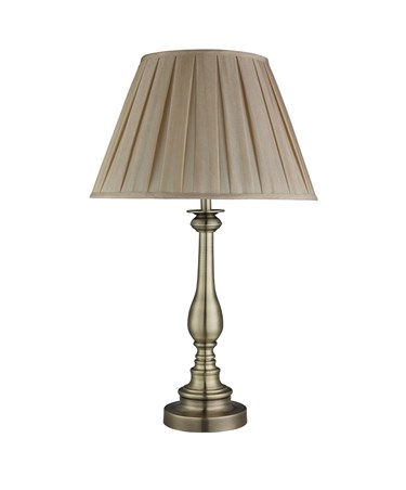 This Antique Brass Table Lamp with Mink Pleated Fabric Shade is classic and ornate. The antique brass finish stand has a traditional shapely design and a spindle base, with a tasteful overlapping mink coloured fabric shade at the top. It looks elegant and sophisticated in any setting.