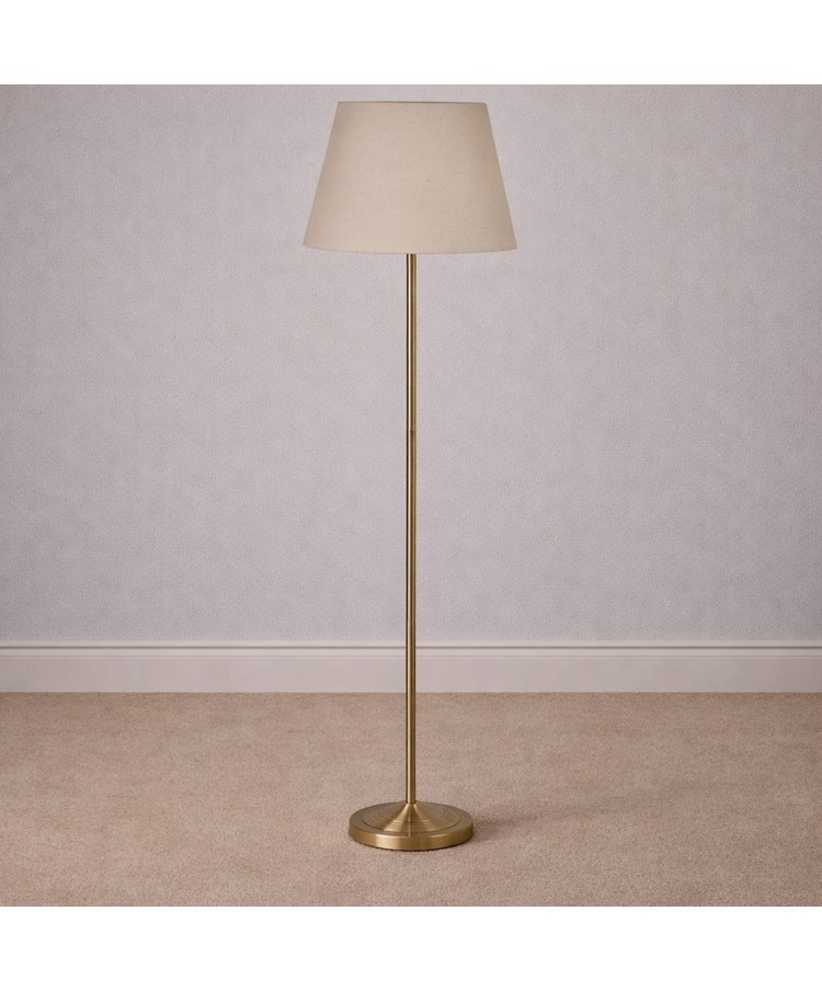 A simple but practical floor lamp, ideal for tucking into a corner of any living space. Sleek lines, quality finish with a choice of shades in a warm antique brass finish. Foot on/off switch